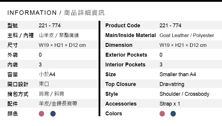長時間不使用時,先將紙團塞進包包內維持包形,並裝入品牌透氣防塵袋,放置陰涼乾燥通風處。