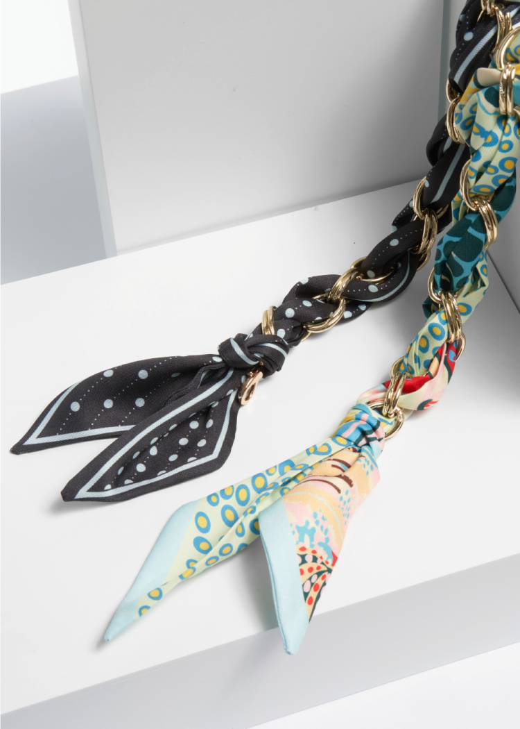 ◆ 可當包包手挽帶或掛飾◆ 印花絲巾搭配金屬鍊帶◆ 金幣飾釦 提升質感